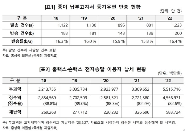10일 더불어민주당 홍성국 의원이 국세청으로부터 제출받은 자료에 따르면 , 과거 16% 수준이었던 종이 납부고지서 반송률은 모바일 전자고지 서비스 도입 이후인 2021 년과 2022 년에도 각각 15.8%, 16.4% 에 머물렀다.
