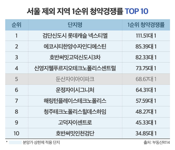 이런 가운데 올해 지방에서 분양된 아파트 청약 경쟁률 상위 10곳 중 9곳은 분양가 상한제가 적용된 곳으로 나타났다. 분양가 상한제가 적용되지 않은 곳은 대전 둔산자이아이파크 1곳 뿐이었다.
