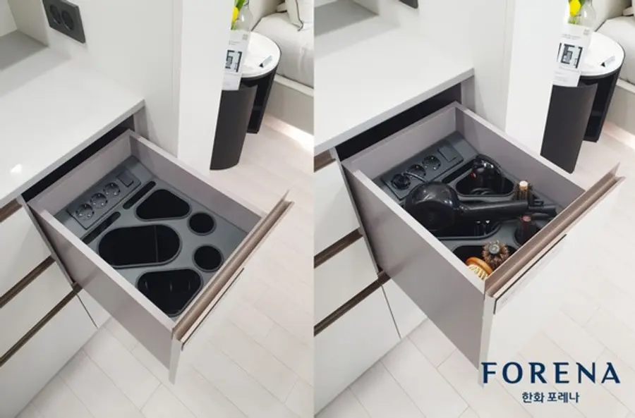 포레나 헤어 드라이기 수납시스템은 헤어드라이기·고데기·브러쉬 등 헤어 제품 보관에 특화된 디자인 수납시스템이다. 정리·보관이 어려운 헤어기기들을 서랍 내장형 콘센트를 적용해 수납 편의성을 더욱 높였다.