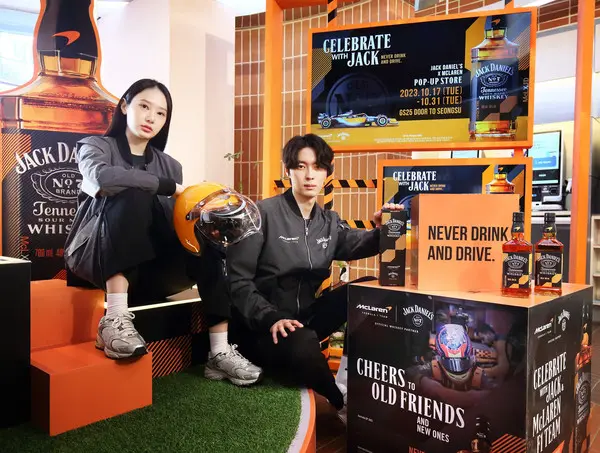 잭 다니엘스가 ‘잭 다니엘스x맥라렌 한정판’ 위스키 출시를 기념해 17일부터 31일까지 2주간 서울 성수동 소재 GS25 플래그십스토어 도어투성수에서 팝업스토어를 운영한다. 팝업 매장 입구에 마련된 포토존에서 모델들이 한정판 위스키와 함께 사진을 촬영하고 있다.