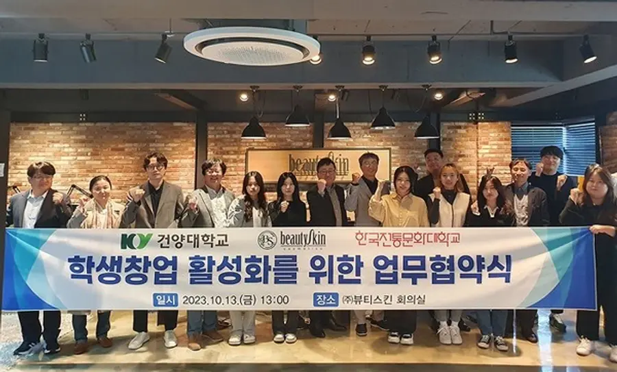 한국전통문화대학교 취창업센터는 지난 13일 뷰티스킨, 건양대학교와 창업활성화 및 창의융합 인재 양성을 위한 ‘한국전통문화대학교·뷰티스킨·건양대학교 산학협력 업무협약(MOU)’을 체결했다고 23일 밝혔다.