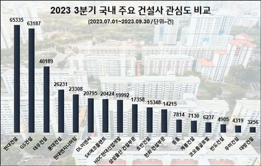 올 3분기 온라인에서 가장 많은 관심을 받은 건설사는 현대건설로 조사됐다. 이어서 GS건설과 대우건설·롯데건설 순으로 온라인 관심도가 높았다.