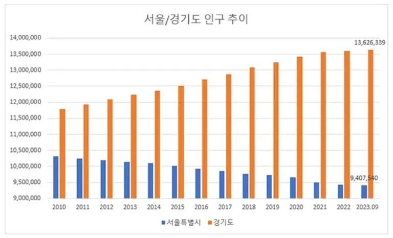 서울의 인구 중 상당수는 경기도로 빠져나가고 있는 것으로 보인다. 경기도 인구는 9월 1362만 6339명을 기록해 2010년보다 183만9717명이 늘어났다. 2022년 기준 전출지·전입지별 이동자수 자료에 따르면 서울에서 경기도로 빠져나간 순이동자수는 6만234명으로 전국 시도 중 가장 높았다.