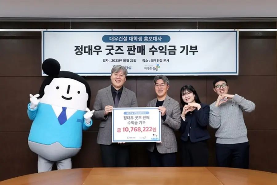 대우건설(대표이사 백정완)은 대우건설 대학생 홍보대사(이하 ‘대대홍’)가 정대우 굿즈 제작·판매 활동으로 얻은 수익금 1076만원을 장애인 복지 단체인 ‘따뜻한동행’에 기부했다고 24일 밝혔다.