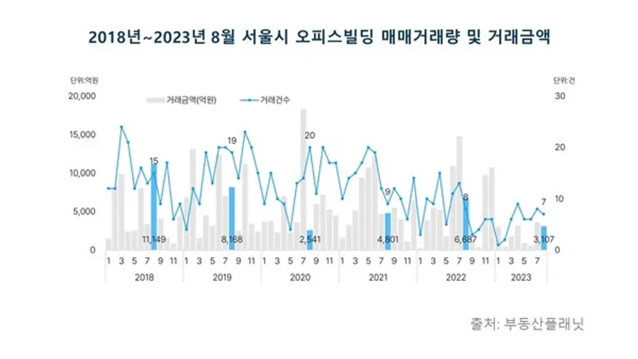 빅데이터 및 인공지능(AI)기반 상업용 부동산 전문기업 부동산플래닛(각자대표 정수민, 엄현포)은 8월 서울시 오피스빌딩 거래량은 총 7건으로 전월(8건)보다 1건 줄었다고 24일 밝혔다.