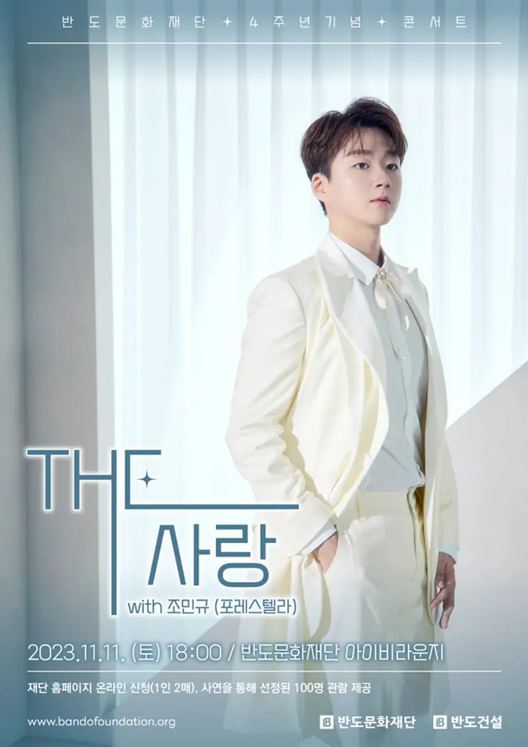 반도건설이 설립한 반도문화재단(이사장 권홍사)은 개관 4주년을 맞아 11월 1일 동탄역 반도유보라 아이비파크 아이비라운지에서 포레스텔라 리더 조민규와 'The 사랑' 공연을 개최한다고 밝혔다.