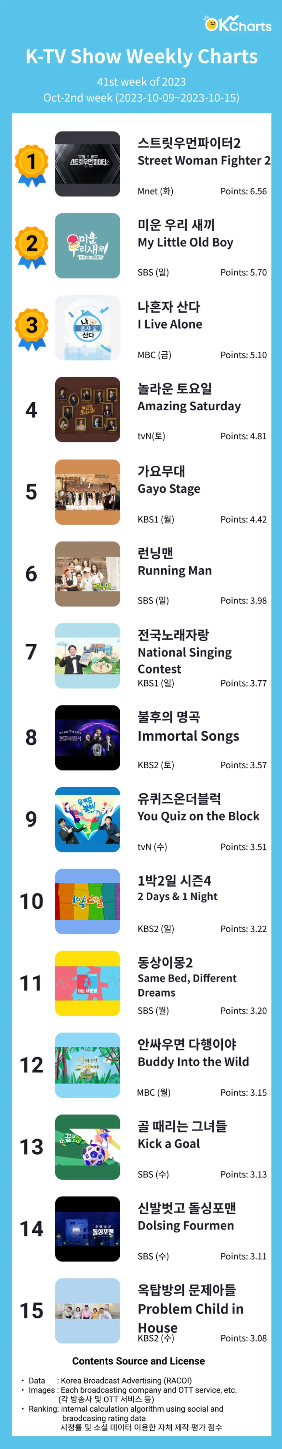 금주 1위는 '스트릿우먼파이터2' 입니다. 10월 2째주 오케이차트 TV 예능 순위입니다. 1위 스트릿우먼파이터2, 2위 미운 우리 새끼, 3위 나혼자 산다 입니다. 스트릿우먼파이터2가 다시 1위를 차지하였습니다. #okcharts#오케이차트#예능#예능차트#스트릿우먼파이터2#미운 우리 새끼#나혼자 산다