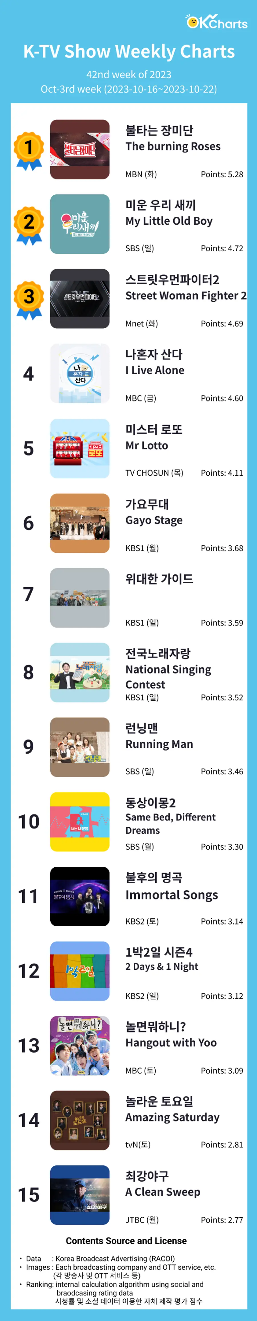금주 1위는 '불타는 장미단' 입니다. 10월 3째주 오케이차트 TV 예능 순위입니다. 1위 불타는 장미단, 2위 미운 우리 새끼, 3위 스트릿우먼파이터2 입니다. #okcharts#오케이차트#예능#예능차트#불타는 장미단#미운 우리 새끼#스트릿우먼파이터2