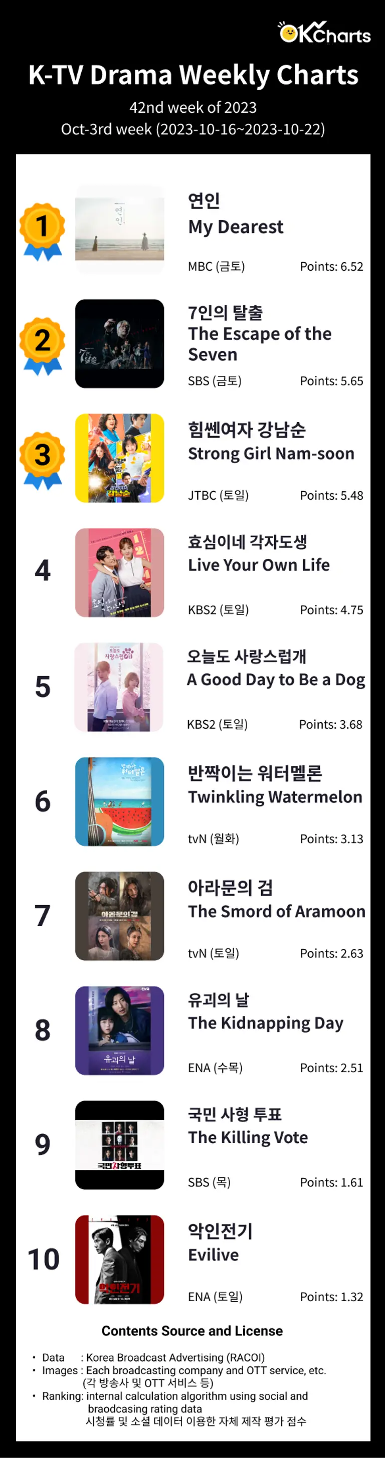 금주 1위는 '연인' 입니다. 10월3째주 TV 드라마 순위 차트입니다. 1위 연인, 2위 7인의 탈출, 3위 힘쎈여자 강남순입니다. 연인이 2주 연속 1위를 차지하였습니다. #오케이차트#okcharts#드라마#드라마차트#드라마순위#연인#7인의 탈출#힘쎈여자 강남순