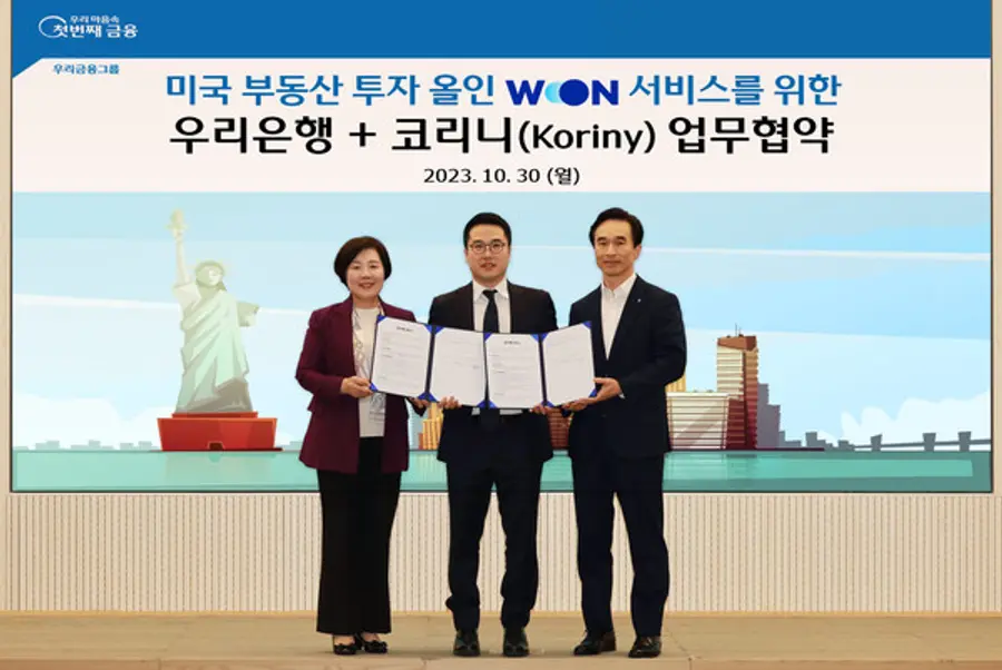 우리은행은 지난 30일 뉴욕 부동산 투자 플랫폼 기업인 코리니와 부동산 투자 관련 올인원 서비스 제공을 위한 업무협약을 체결했다고 1일 밝혔다.