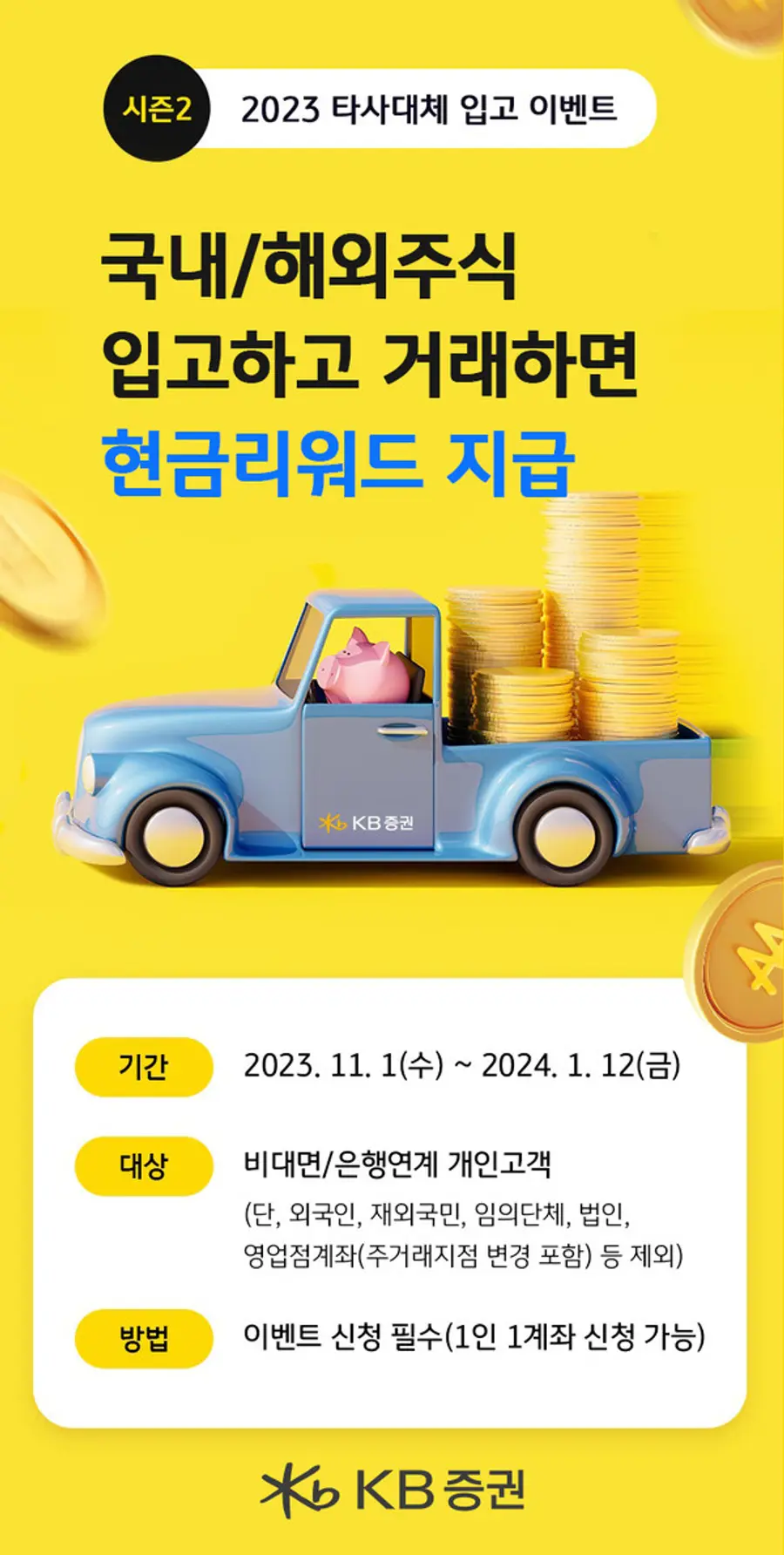 KB증권(사장 박정림, 김성현)은 비대면/은행연계 개인고객을 대상으로 ‘2023 타사대체 입고 이벤트 시즌2’를 실시한다.