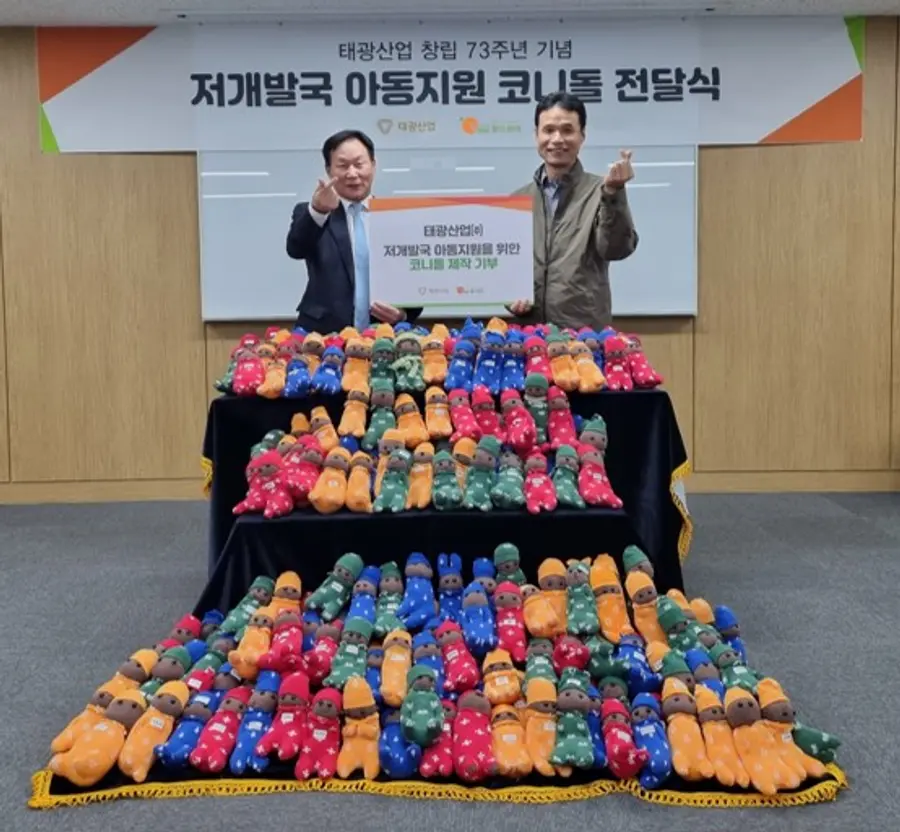 태광그룹 섬유∙석유화학부문 계열사인 태광산업·대한화섬은 지난 3일 서울 장충동 본사에서 (사)월드쉐어와 ‘애착인형 코니돌 전달식’을 진행했다.