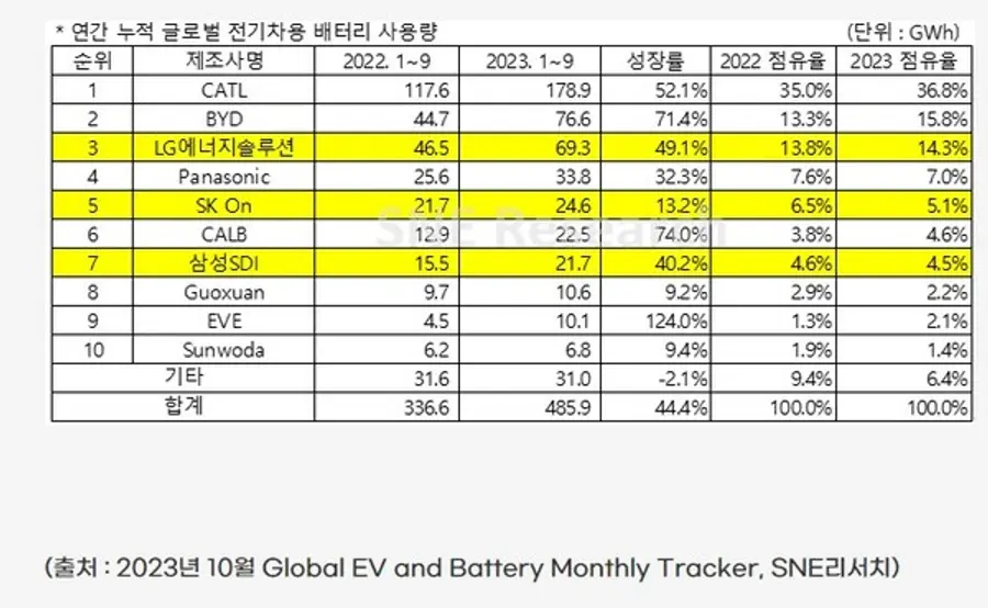 LG에너지솔루션(이하 'LG엔솔')의 전기차 배터리 점유율이 14.3%로 전년비 0.5%p 증가했다. 반면 SK온과 삼성SDI의 글로벌 점유율은 뒷걸음질했다. 7일 에너지 전문 시장조사업체 SNE리서치에 따르면 1∼9월 세계 각국에 등록된 전기차(하이브리드·플러그인 하이브리드 포함)의 배터리 총사용량은 약 485.9기가와트시(GWh)로, 전년 동기 대비 44.4% 늘었다.