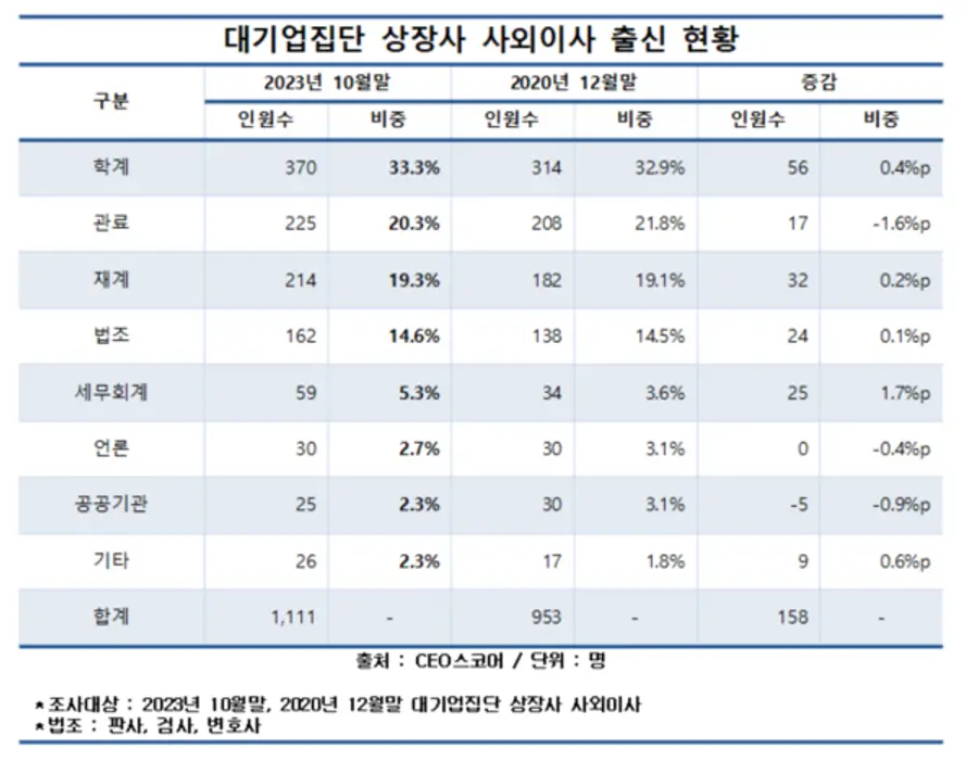 관료·법조 출신에 이어 △학계 33.3%(370명) △재계 19.3%(214명) △세무회계 5.3%(59명) △언론 2.7%(30명) △공공기관 2.3%(25명) △기타 2.3%(26명) 순으로 사외이사 출신 비중이 높았다.