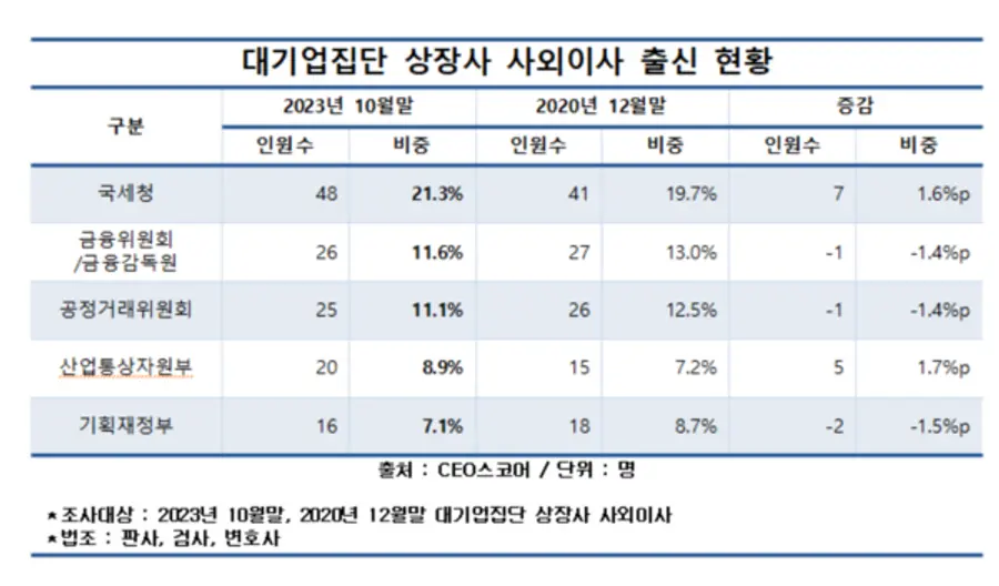 관료 출신 사외이사 중에서는 국세청 출신이 48명(21.3%)으로 가장 많았다. 이어 공정거래위원회가 25명(11.1%), 산업통상자원부 20명(8.9%), 기획재정부 16명(7.1%), 금융감독원 14명(6.2%), 금융위원회 12명(5.3%), 감사원 10명(4.4%) 등이 뒤를 이었다.