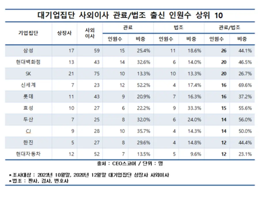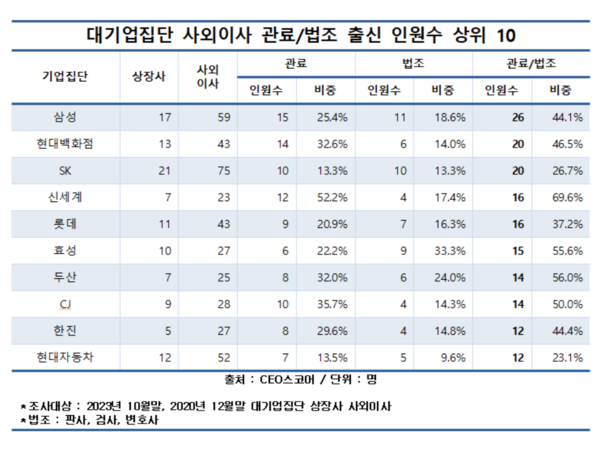 관료·법조 출신 사외이사가 가장 많은 곳은 삼성그룹이었다. 삼성그룹은 전체 사외이사 59명 중 26명(44.1%)가 관료·법조 출신이었다. 이어 현대백화점(20명), SK(20명) 등이 관료·법조 출신을 20명 이상 선임한 곳으로 조사됐다.