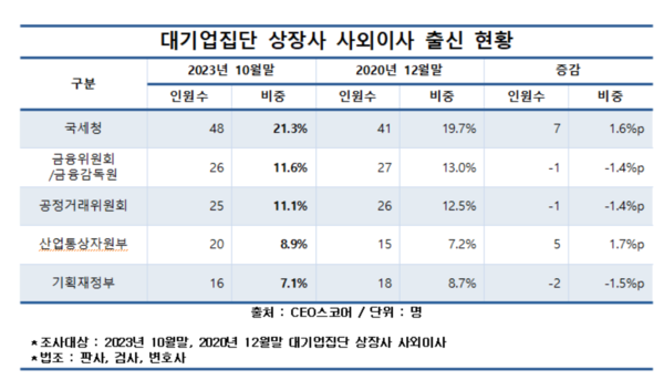 대기업집단 소속 상장사 사외이사 10명 가운데 3명이 공무원 출신이거나 판·검사 출신 변호사였고, 공무원 중에선 국세청 출신 비중이 제일 높은 것으로 나타났다.