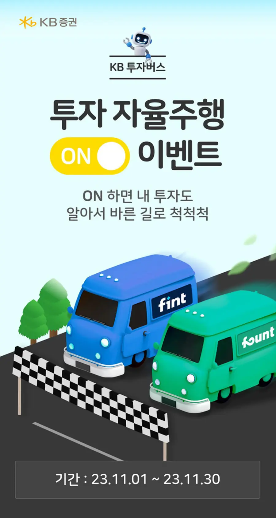 KB증권은 ‘자율주행 서비스’ 운용사 추가와 투자 범위 확대 기념으로 오는 30일까지 ‘투자 자율주행 On’ 이벤트를 실시한다고 10일 밝혔다.
