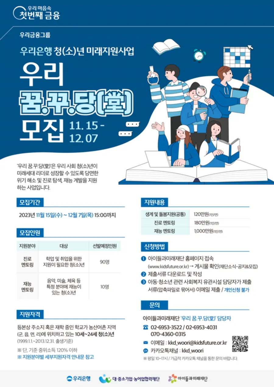 우리은행 관계자는 “우리은행은 우리 사회를 이끌어갈 미래세대의 성장을 지원하기 위한 다양한 노력을 기울이고 있다”며 “우리 청년과 청소년들이 우수한 인재로 성장할 수 있도록 지원하는 「우리 꿈.꾸.당(堂)」1기 모집에 많은 관심과 참여 바란다”고 말했다.