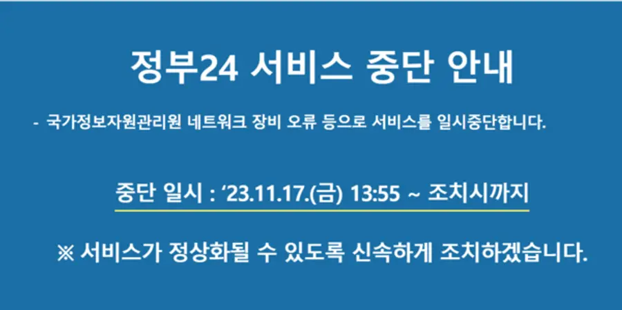 공지에서 행안부는 "국가정보자원관리원 네트워크 장비 오류 등으로 서비스를 일시 중단한다"고 안내했다.