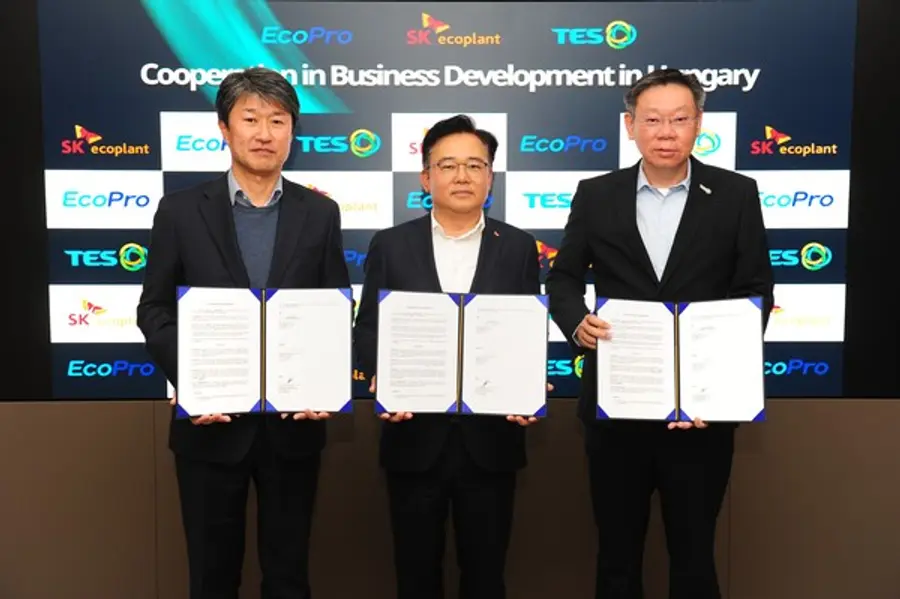 SK에코플랜트는 국내 1위 배터리 양극재 기업 에코프로와 자회사 전기∙전자폐기물(E-waste) 전문기업 테스, 3사가 ‘헝가리 배터리 재활용 사업 협력’을 위한 업무협약(MOU)을 체결했다고 19일 밝혔다.