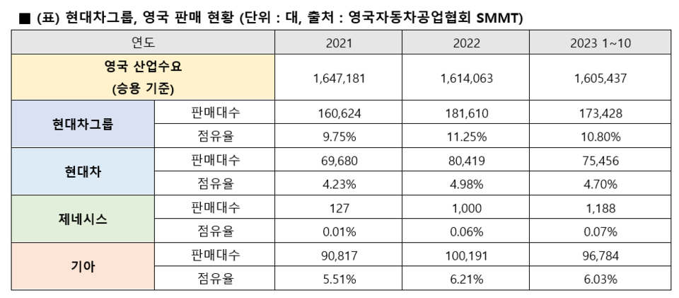 현대차그룹은 전동화 전환이라는 시장 변화에 동참하며 라인업 확대를 통해 전기차, 하이브리드 판매를 적극 늘려 왔다. 현대차그룹의 올해 1~10월 영국 친환경차(BEV+HEV) 판매대수는 8만442대로 지난해 같은 기간보다 6.7% 증가했다. 해당 기간 전기차는 4.2% 증가한 2만8456대를, 하이브리드는 8.2% 늘어난 5만1986대를 기록했다.