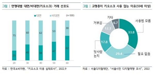 20일 하나은행 하나금융경영연구소가 최근 발간한 <리테일 무인화, 임계점이 다가온다>는 보고서에 따르면 50세 이상 고령층의 33.8%가 키오스크 사용 방법을 모른다고 답했다. 29.4%는 '필요없다'고 아에 외면하고 있으며, 미숙한 사용법으로 뒷사람눈치가 보인다는 응답률도 17.8% 나왔다. 키오스크에 대한 거부감을 표한 의견도 12.3%에 달했다.