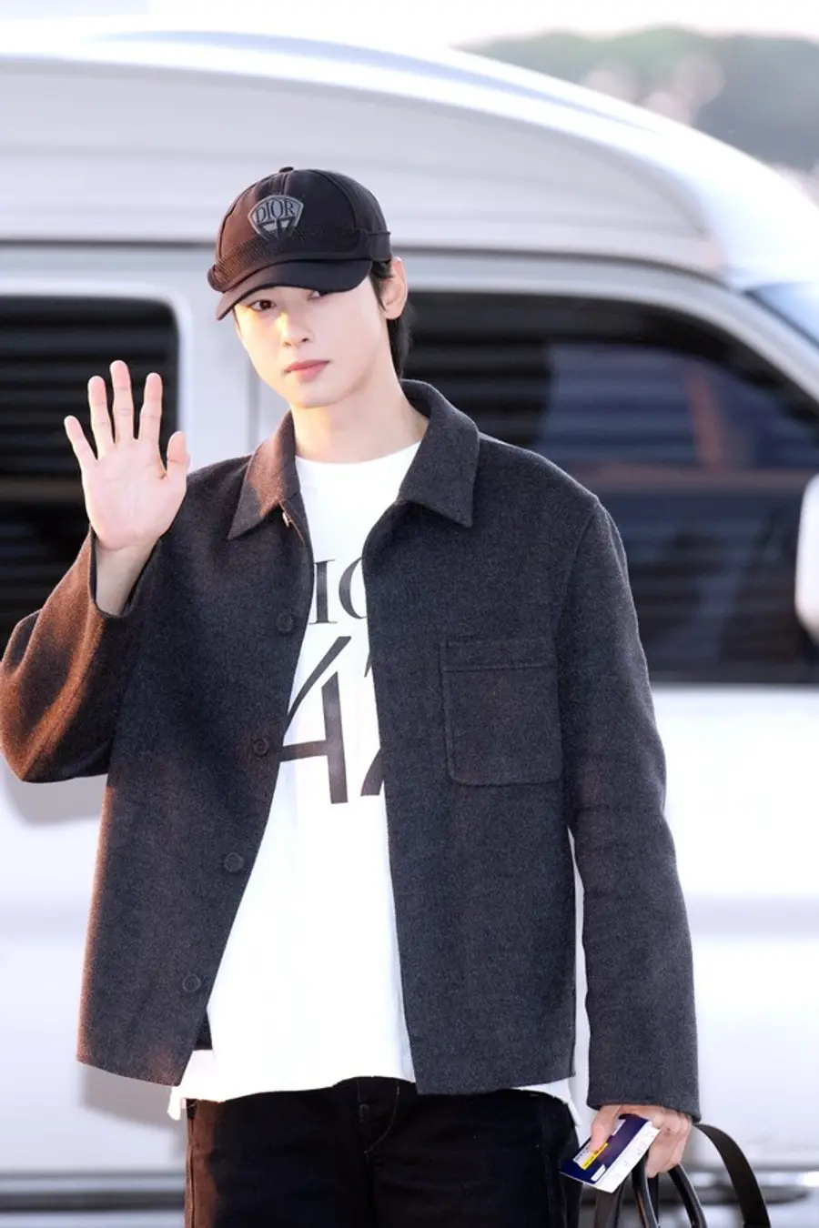 디올 앰버서더로 활동하고 있는 차은우는 다크한 그레이 컬러의 워크웨어 재킷과 블랙 첼시 부츠와 캔버스 캡 등 ‘디올’ 제품으로 공항패션을 완성했다.