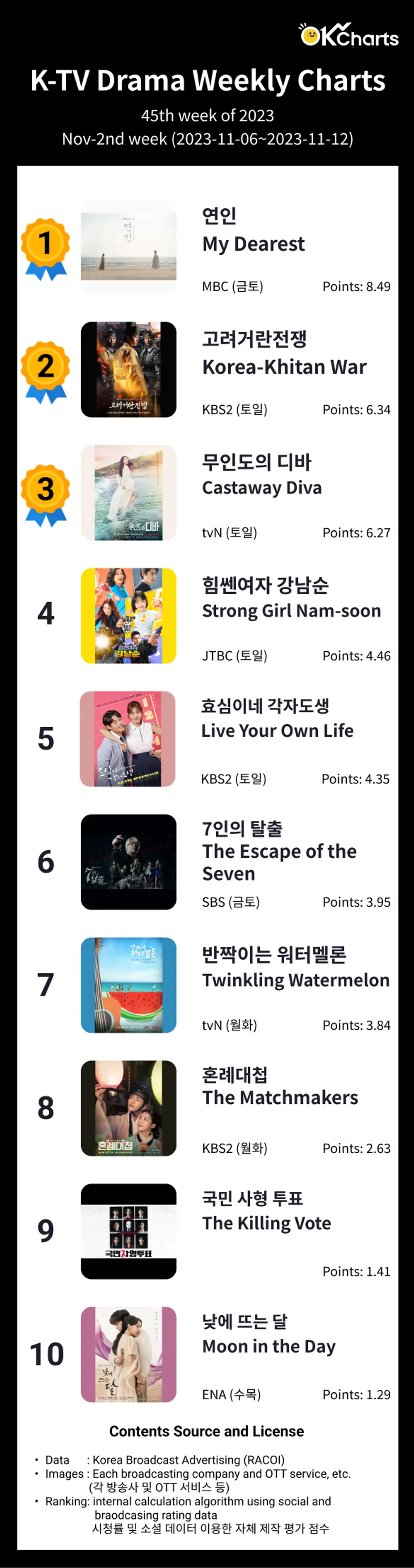 금주 1위는 '연인' 11월2째주 TV 드라마 순위 차트입니다. 1위 연인, 2위 고려거란전쟁, 3위 무인도의 디바 입니다. 최강 동안 '최수종'의 '고려거란전쟁'이 첫주부터 2위를 차지하였습니다. #오케이차트#드라마순위#연인#고려거란전쟁#kdrama