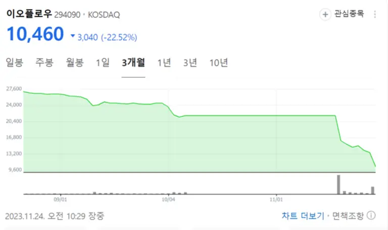 24일 오전 10시10분 현재 이오플로우는 전거래일보다 23.85% 떨어진 1만280원으로 간신히 1만원대를 방어하고 있다. 지난 16일 매매재개 이후 주가는 반토막이 났다.