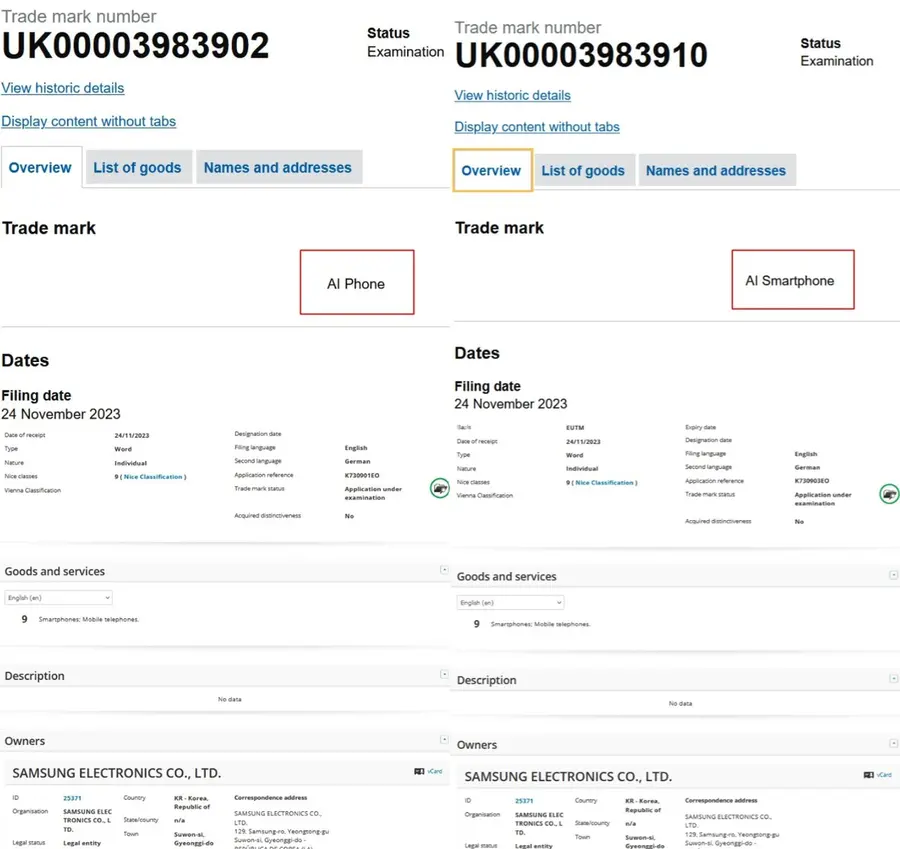 27일 네덜란드 IT전문지 갤럭시클럽에 따르면 삼성전자는 최근 유럽연합 지식재산청(EUIPO)과 영국 지식재산청에 각각 두 건의 상표권을 신청했다. 'AI폰(AIPhone)'과 'AI스마트폰(AISmartphone)'이다.