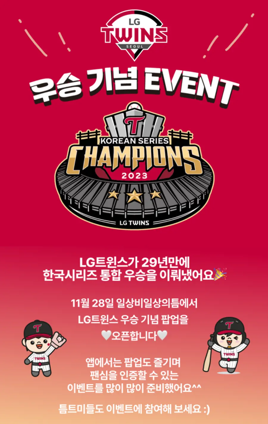 LG유플러스 김다림 마케팅전략담당은 “LG트윈스의 우승을 팬 분들과 함께 기념하기 위해 팝업, 이벤트, 팬사인회 등 다양한 활동을 마련하게 됐다”며 “기존 팬뿐만 아니라 더 많은 고객이 틈에 방문해 LG트윈스의 매력을 느낄 수 있길 바란다”고 말했다.