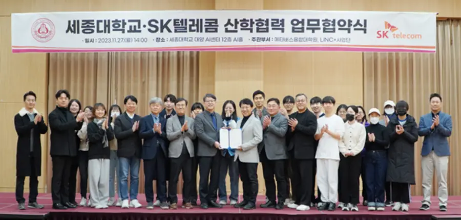 SK텔레콤은 세종대학교 메타버스융합대학원과 함께 글로벌 AI 및 미디어 콘텐츠 제작 패러다임 선도를 목표로 산학협력에 관한 업무협약(MOU)을 27일 체결했다고 밝혔다.