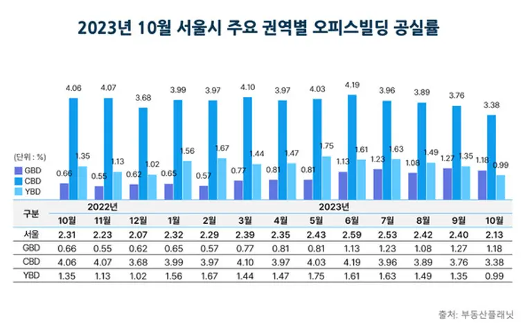 9월 대비 0.27%포인트 감소한 수치로 올해 제일 낮은 공실률이다. 통상 5% 안팎인 자연공실률을 크게 밑도는 수치로 글로벌 최대 공유오피스 위워크의 파산 신청 등 서구권 오피스 공실률이 20%에 육박하는 것과는 정반대의 모습을 보이고 있다.