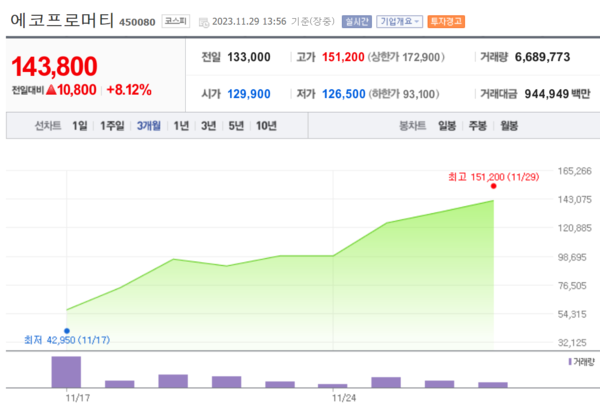 그런가 하면 지난 17일 상장, 아직 잉크도 마르지 않은 에코프로머티는 14만2900원으로 7.44% 급등하면서 3거래일째 상승세를 이어가고 있다.