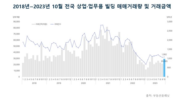 10월 전국 상업업무용 빌딩 거래량이 소폭 올랐지만 8개월째 1천 건대에 머물려 뚜렷한 반등세를 찾지 못하고 있다. 고금리로 인한 이자부담이 커져 고가의 부동산에 대한 거래도 좀처럼 살아날 기미가 보이지 않는 것으로 나타났다.