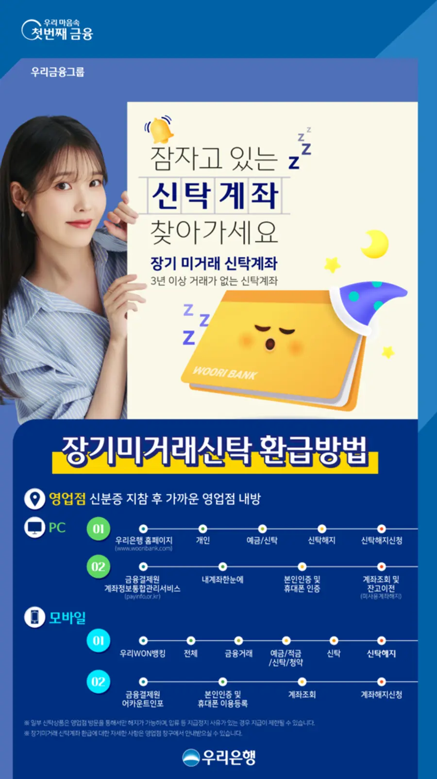 우리은행은 장기 미거래 신탁자산 대상 확인 안내를 위해 잔액 5만원 이상 계좌 보유 고객에게 우편으로 안내문을 발송하고, 문자, 이메일, 유선으로 관련 내용을 추가 안내할 예정이다.