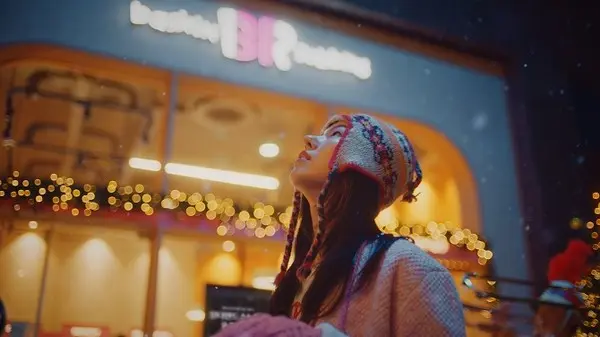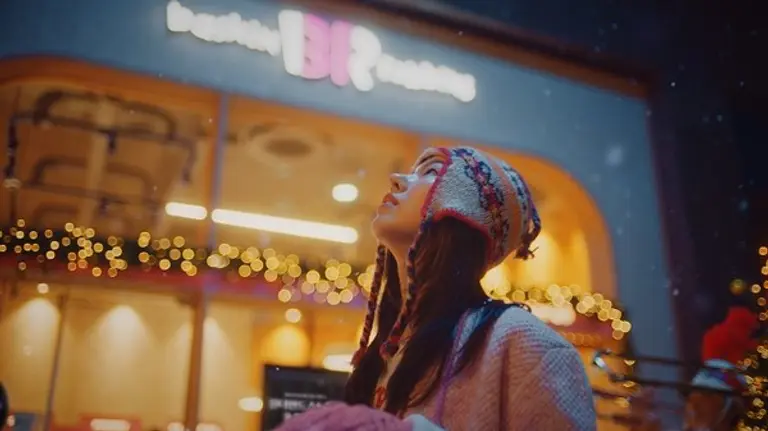 영상은 화려한 트리와 조명으로 크리스마스 단장을 한 배스킨라빈스 매장에서 손님이 아이스크림 케이크를 구매하며 시작된다.