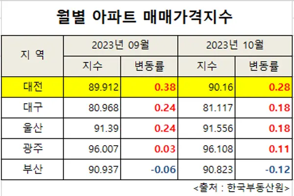 5일 한국부동산원 통계자료에 따르며 10월 기준 대전시 아파트 매매가격지수는 9월보다 0.28%(89.9→90.2) 상승하며 5대 광역시 중 가장 높은 변동률을 보였다. 대구와 부산으로 모두 0.18% 상승했고 광주도 0.11% 올랐다. 부산은 0.12% 하락했다.