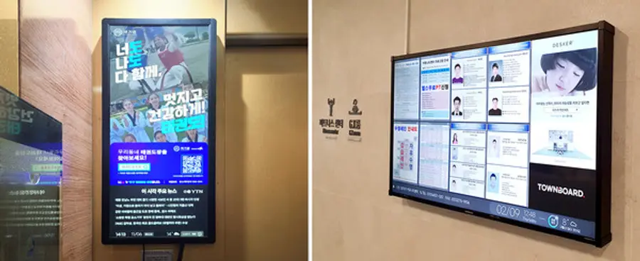 타운보드 세로형 모니터는 주로 아파트 엘리베이터에 설치했다. 자체 개발 콘텐츠부터 기업 광고에 이르기까지 다양한 소식을 입주민들에게 손쉽게 전달할 수 있어 서초구 래미안 원베일리, 송파구 리센츠, 부산 해운대LCT 등 전국 대단지 아파트에서 600만 고객과의 소통 창구로 활용되고 있다.