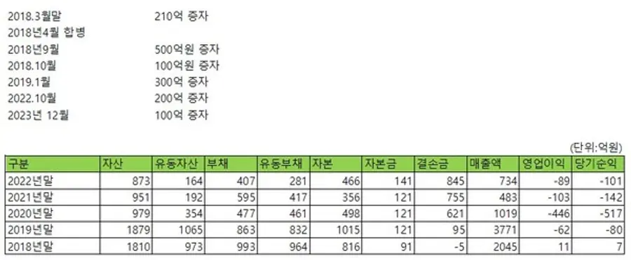 사업연도 1차년도인 2018 회계년도 자산 1810억원, 부채 993억원, 자본금 816억원던 재무 상황은 작년말 자산 873억원, 부채 407억원, 자자본총계 466억원으로 쪼그라들었다.