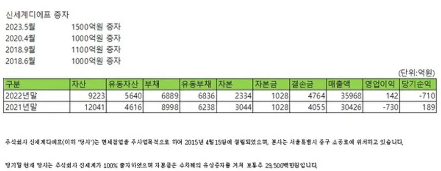 그해 9월과 10월에 각각 500억원과 100억씩 증자한데 이어 2019년1월에도 300억원을 증자해 납입자본금을 키웠다. 하지만 매년 영업적자 등 결손금이 늘면서 2022년 10월200억원을 추가 증자한데 이어 최근 재차 100억원 규모 증자를 통한 긴급 수혈 자금을 모기업인 신세계디에프로부터 지원받았다.