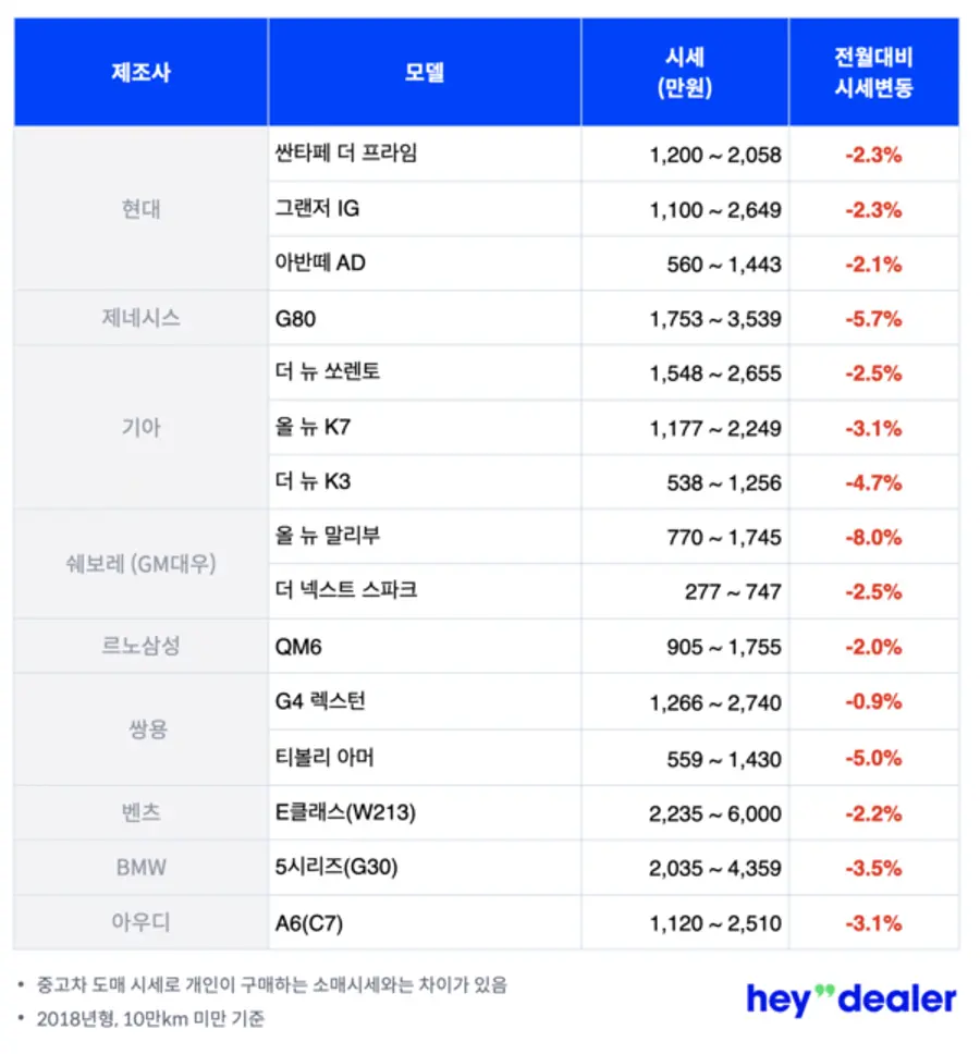 딜러에 따르면 비수기를 맞아 국산과 수입을 포함한 전 차종이 시세가 하락했다. 쉐보레의 올 뉴 말리부가 8.0%로 가장 크게 떨어졌다. 제네시스 G80은 5.7%, 티볼리 아머는 5.0% 떨어졌다.