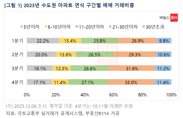 부동산R114가 국토교통부 실거래가 자료를 통해 2023년 매매 거래된 수도권 아파트를 분석한 결과 준공 10년 이하 구간에서는 거래비중이 감소한 반면 10년 초과 아파트는 비중이 증가했다. 특히 21-30년 이하 아파트 매매 거래비중은 1분기 26.9%에서 4분기 33.0%로 가장 많이 늘었다. 반면 5년 이하 아파트 거래비중은 4분기 17.1%로 1분기 22.2% 대비 5.1%P 감소했다.