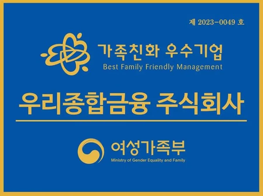 우리종합금융은 서류 심사와 대표이사 인터뷰를 비롯해 직원 만족도 조사, 기관 현장심사, 가족친화인증위원회 심의 결정 등 엄격한 심사 절차를 거쳤다. 그 결과 우리은행, 우리카드에 이어 그룹 중 세 번째로 가족친화기업 인증을 획득했다.