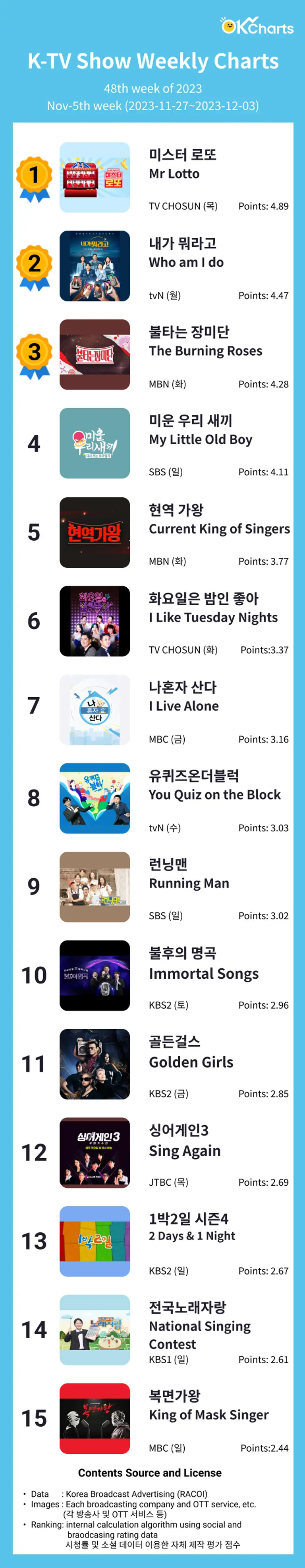 1위 미스터 로또, 2위 내가 뭐라고, 3위 불타는 장미단 입니다.
