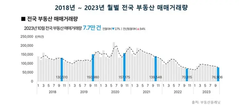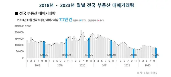 올해 10월 전국에서 발생한 부동산 매매거래량은 7만 6906건으로 집계됐다. 이는 8월(8만7378건) 이후 2개월 연속 줄어든 수치다. 올해 최저치를 찍었던 1월(5만 9382건)에 이어 두 번째로 낮은 거래량이다. 이전까지 두번째로 낮았던 9월(7만9038건)과 거래량 대비 2.7% 하락하며 기록을 갈아치웠다. 10월 매매거래금액은 23조7187억원으로 직전월 26조1340억원 대비 9.2% 감소하며 거래량보다 더 큰 하락폭을 보였다.