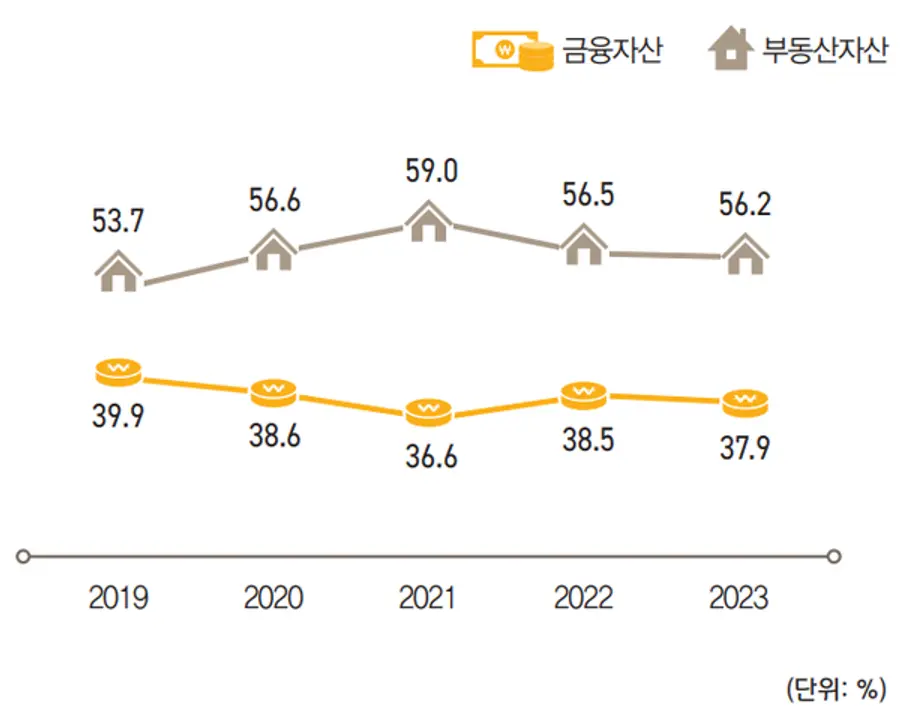 부자의 자산에서 부동산이 56.2%를 차지했고, 금융자산 비중은 37.9%였다. 보유한 금융자산은 총 2747조 원으로, 한국 전체의 59%에 달했다. 다만 증시 부진으로 금융자산은 5년 만에 처음 감소세(4.7%)를 기록했다.