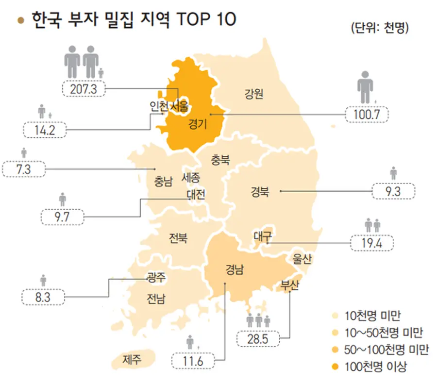 부자의 70.6%가 서울, 경기, 인천 등 수도권에 집중됐다. 부자가 많이 사는 지역에 부(富)가 집중됐는지 분석한 부 집중도를 살펴보니, 서울시와 세종시의 부 집중도가 높았다. 서울에서는 강남구, 서초구, 종로구, 용산구 등 4개 자치구가 높았고, 성동구가 올해 처음 부촌으로 등극했다.