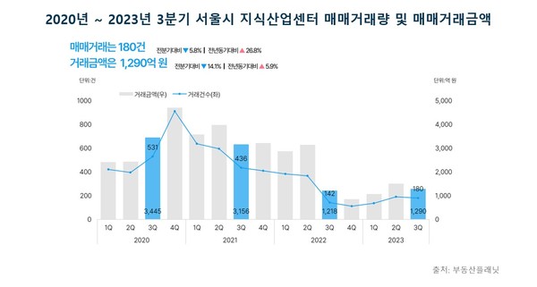 총 374개의 지식산업센터가 위치한 서울시의 3분기 거래량은 직전분기(191건) 대비 5.8% 줄어든 180건으로 나타났으며, 매매거래금액은 14.1% 줄어든 1290억원으로 집계됐다.